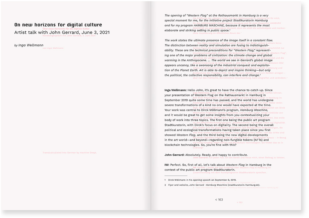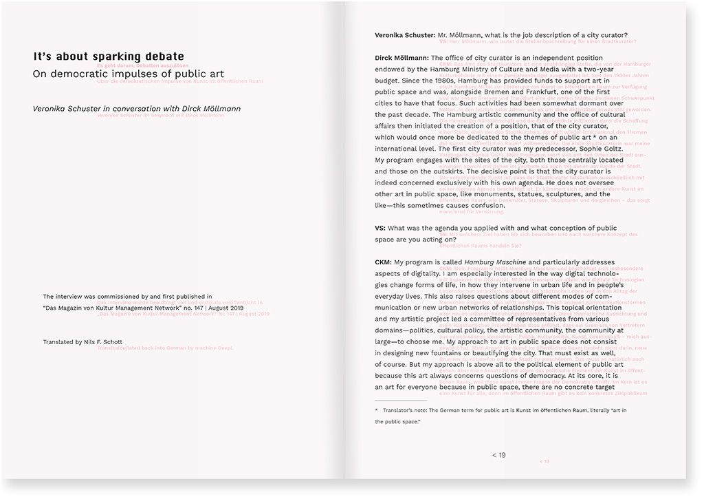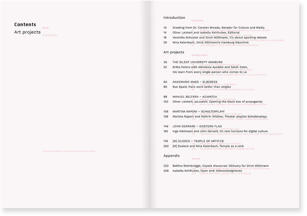 Mit dieser Publikation wird das von Dirck Möllmann entwickelte und kuratierte Programm dokumentiert, aktualisiert und erweitert. Die von ihm eingeladenen Künstler*innen haben Bildstrecken über ihre Projekte gestaltet und mit Dialogpartner*innen ihrer Wahl über ihre Arbeit gesprochen. Die künstlerischen Beiträge werden ergänzt durch Essays internationaler Autor*innen, die sich – angelehnt an Möllmanns Konzept HAMBURG MASCHINE – mit den Themen Digitalität, Urbanität, Arbeit, Care, Ökologie, Pandemie, Kollektivität, Ökonomie und dem alles verbindenden Internet in unterschiedlicher Art und Weise befassen. Der künstlerisch gestaltete Band liefert Anstöße zum Denken und Handeln in Zeiten der Digitalisierung des urbanen Lebens, die durch die COVID-19-Pandemie allzu hastig fortschreitet.
